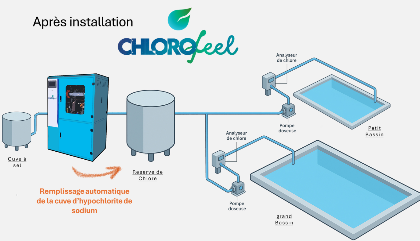 Le générateur de chlore in situ est installé en amont de votre installation existante. Vous l'alimentez en sel, et il remplit votre cuve de chlore à votre place, automatiquement, avec de l'hypochlorite de sodium frais, prédilué pour éviter les bouchages: vraiment prêt à l'emploi. A aucun moment vous ne manipulez de chlore